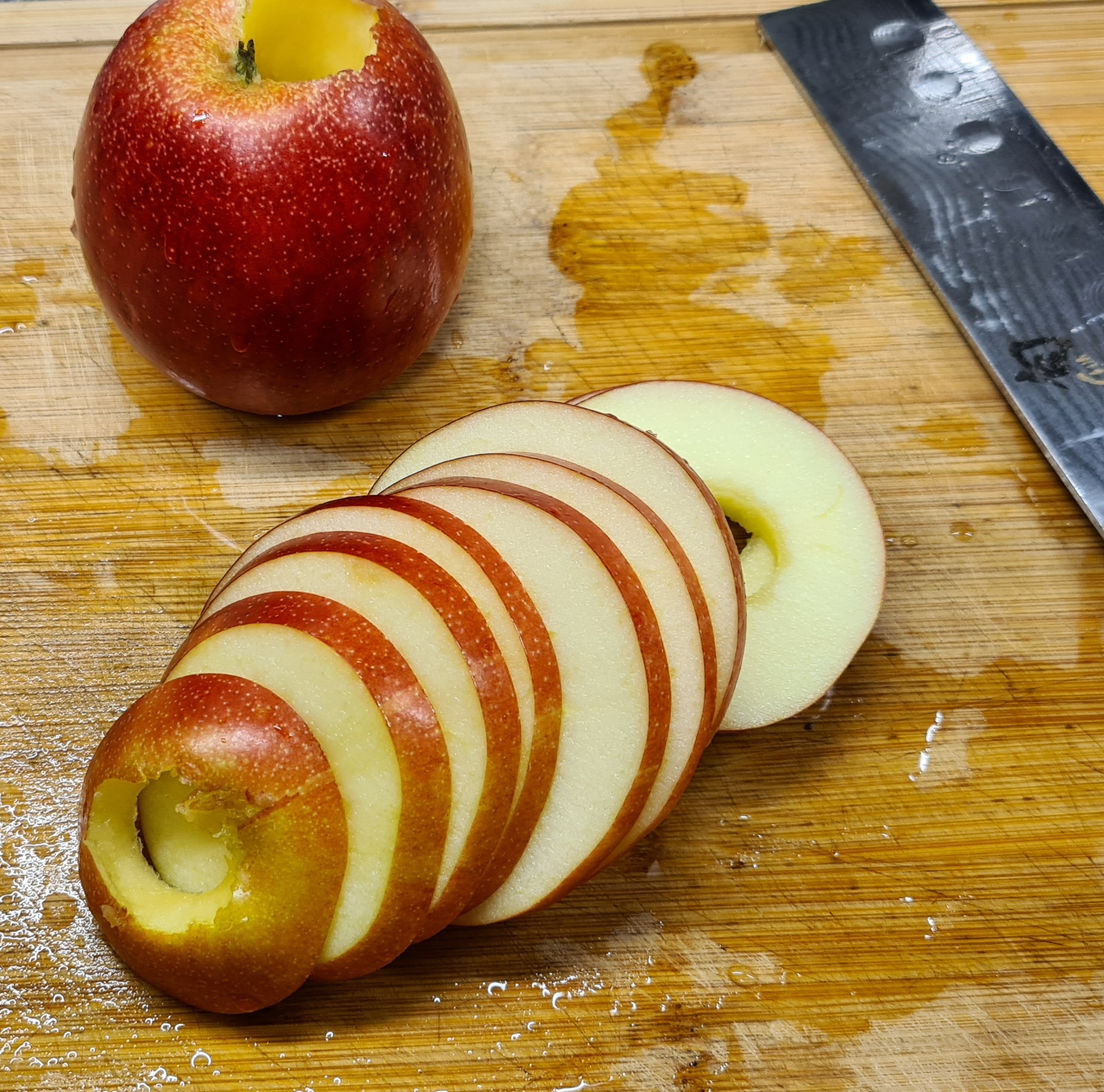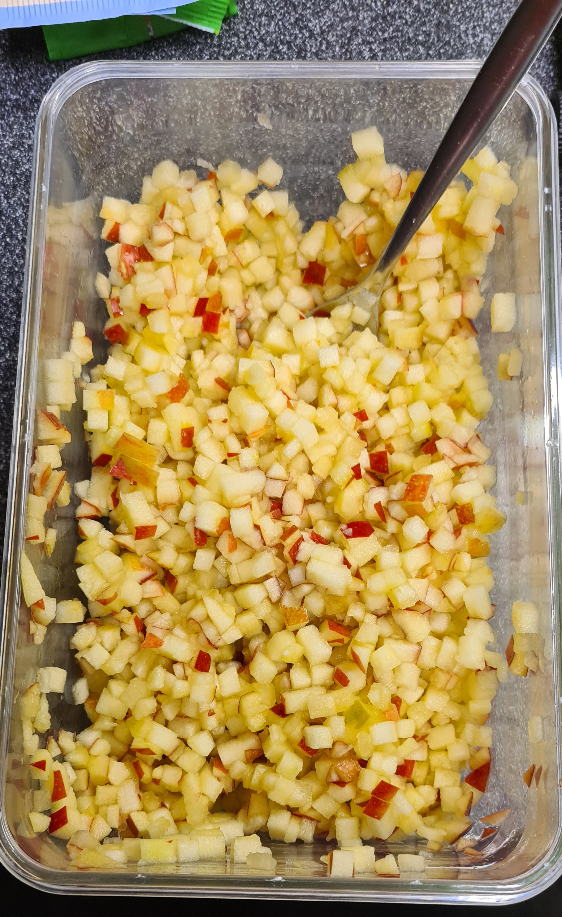 In der Zeit die Äpfel ungeschält (natürlich gewaschen) in sehr feine Scheiben und dann in Würfel schneiden. Ich nehme vorher das Kerngehäuse mit einem Kerngehäuse-Locher raus.