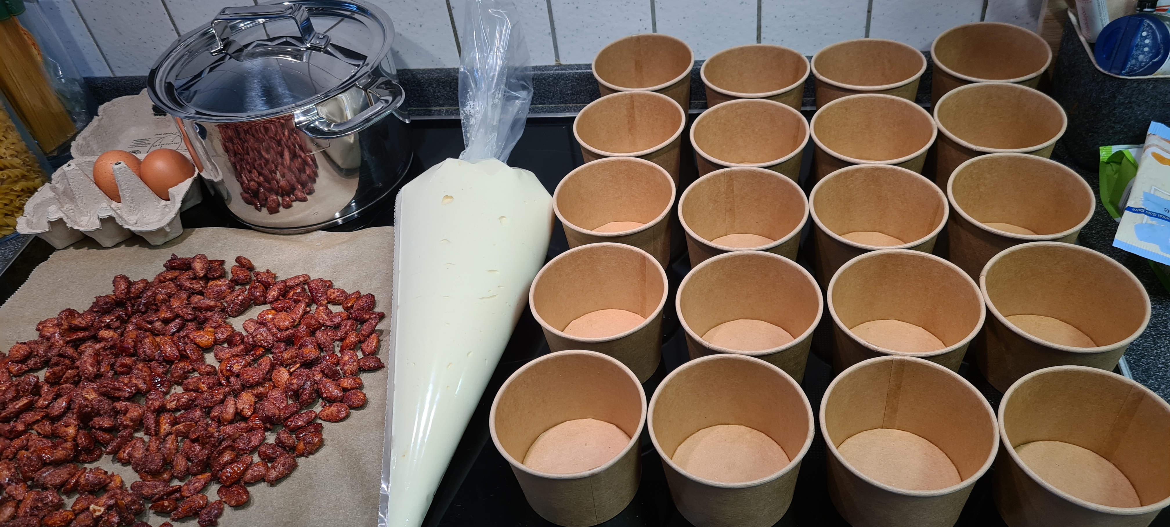 Jetzt die kalten gebrannten Mandeln klein hacken und etwa einen Esslöffel davon auf die Mousse geben, dann 2-3 Esslöffel der erkalteten Äpfel über die Mandeln geben (die Mandeln werden sich bei längerer Lagerung auflösen aber das schmeckt dennoch sehr lecker, wer will, dass die Mandeln noch knacken, der muss kurz vorm Servieren das Glas fertig befüllen.)